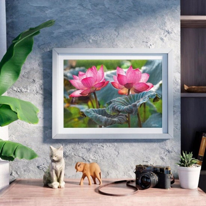 This composition depicts the lotus in its peak moment, when the blossoms are fully opened. The flowers retain their full colors, showing a gentle gradation of deep pink to nearly transparent lighter shades. The beautiful blossoms, which rise on stems high out of the water, represent the purity and peace. Arranging this puzzles calms you down and allows you to relax.