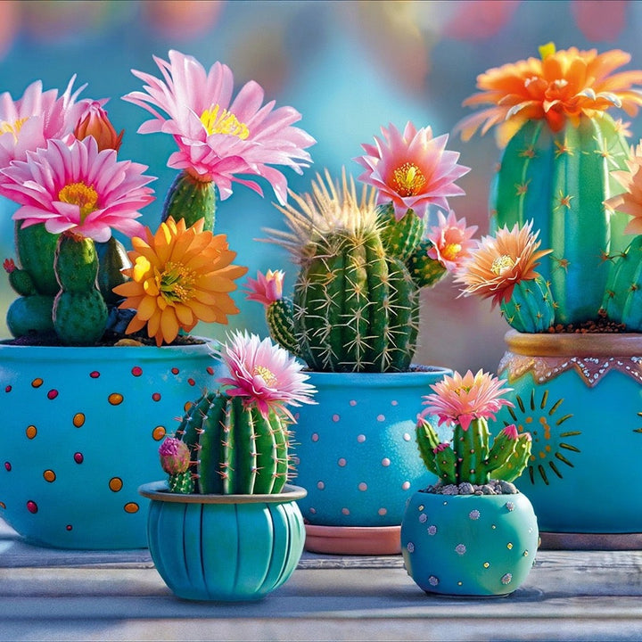 In the comfort of home, blooming cactus plants thrive in their pots. This vibrant illustration captures the feelings of peace and joy.
