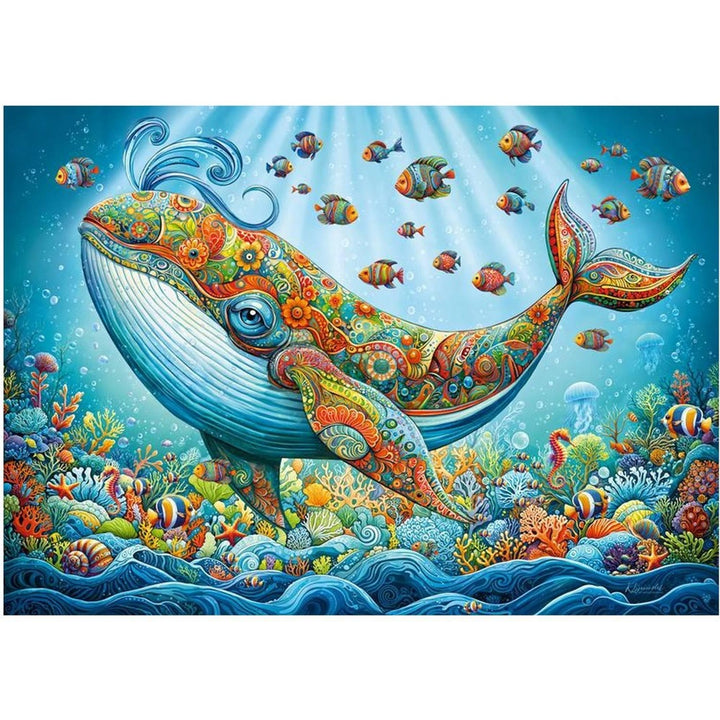 Here is an extraordinary and unique puzzle that features a majestic whale with a friendly expression that is adorned with colorful floral and paisley patterns, creating a dreamlike marine environment. The unique art style blends whimsical details, giving the whale fantastical aura. This is true joyful scene with a lovely Prince of whales.