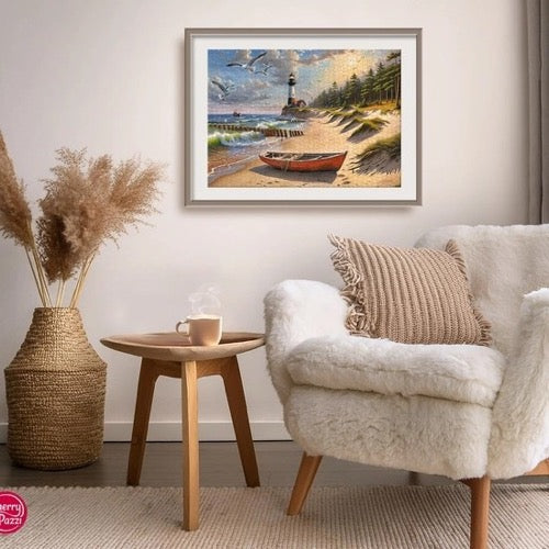 Wonderful view of the Baltic Sea coastline with a lighthouse that stands tall on a cliff overlooking sandy dunes. The picture is delicate and dynamic at the same time.This scene perfectly balances nature's calm with subtle activity. Here is a puzzle for everyone longing for the sound of waves.