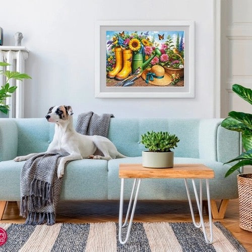 It is a charming garden scene bursting with color and warmth. A pair of gleaming gold rubber boots, surrounded by an abundance of blooming flower and a straw hat rests gently nearby. It's a sense of a leisurely day spent tending to nature and the joy of gardening.