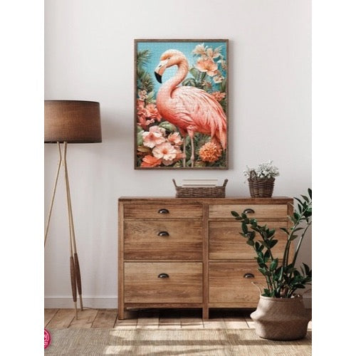 Stunning soft, rosy feathers glow under the warm sunlight contrasting beautifully with the lush floral surrounding and gentle blue background. This elegant flamingo in its radiant pink, urges us to think positively, embrace creativity and shine with confidence. So 'think pink', go with the flow and arrange our puzzle with joy.