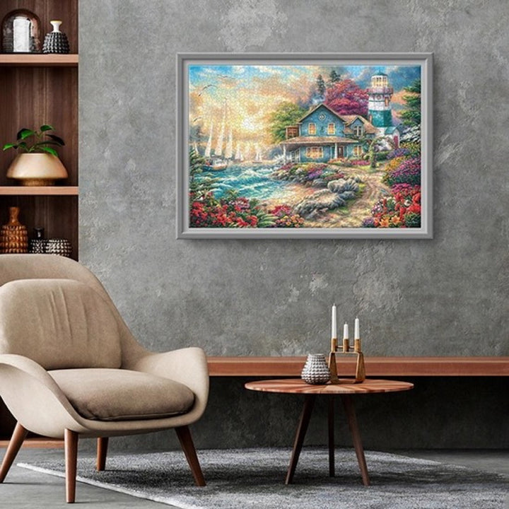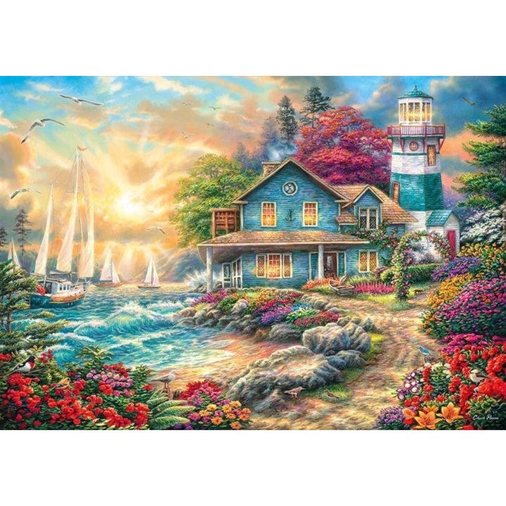 A cozy cottage with a lighthouse stands along the shores surrounded by colorful blooming flowers. The sun rises over a wonderful view of the sea. The water is covered by sailboats. Pay close attetnion because this picture is just mind-blowing.